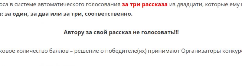 4.7. Голосующему необходимо отдать свои голоса в системе автоматического голосования за три рассказа из двадцати четырёх, которые ему понравились больше всех. Автору за свой рассказ не голосовать!!!
