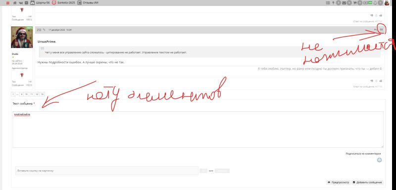 Чет у меня все управление сайта сломалось - цитирование не работает. Управление текстом не работает.