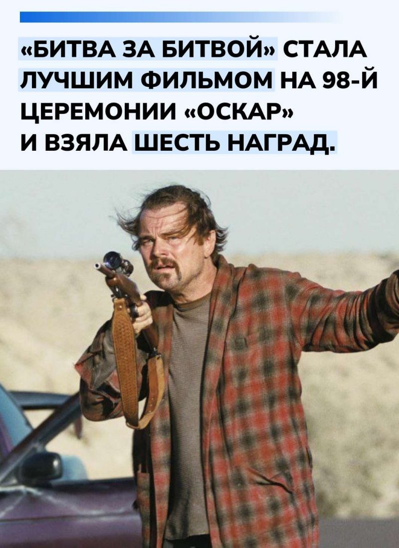 В Лос-Анджелесе подвели итоги 98-й церемонии вручения премии «Оскар». Картина Пола Томаса Андерсона была представлена в 14 номинациях. Майкл Б. Джордан получил награду за лучшую мужскую роль в «Грешниках», Джесси Бакли — за лучшую женскую роль в «Хамнете», а сам Андерсон победил в категории «Лучший режиссёр».